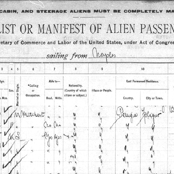 Salpò da Napoli con la famiglia il 23 novembre 1907, all’età di 7 anni, arrivando a Ellis Island l’8 dicembre 1907 a bordo della SS Cretic.