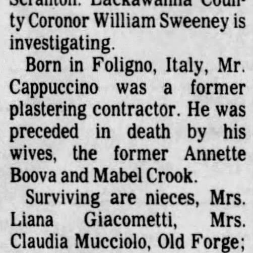 Augusto Cappuccino, figlio di Giuseppe Cappuccino e Palmira Tradardo, nacque intorno al 1857 a Foligno. Morì il 12 settembre 1910, pochi anni dopo essere entrato negli Stati Uniti. Fu sepolto nel cimitero di Washburn Street a Scranton, Pennsylvania.