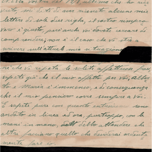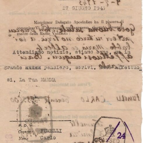 30 novembre 1944: “…. finalmente dopo 15 mesi ho ricevuto una vostra lettera, la gioia di sapervi tutti bene è indescrivibile. Ora sono tranquillo poiché il pericolo è passato. Io al solito godo buona salute, non datevi pensiero alcuno per me, invece sono io che debbo preoccuparmi e mi preoccupo per voi poiché da lettere giunte e dai giornali sono venuto a conoscenza che in Italia mancano molte materie di prima necessità, generi alimentari, vestiario e medicinali. Infinite sono le domande che desidero rivolgervi, ma come fare ad enumerarle tutte? Come avete passato il periodo di occupazione tedesca? Siete stati molestati? Quali privazioni avete sopportato? Alberto come ha fatto a salvarsi e rimanere costì con voi? I parenti e gli amici come stanno? Voi babbo e mamma carissimi, la cara Maria ed Alberto, come state ora? L’importante è che siete salvi”.