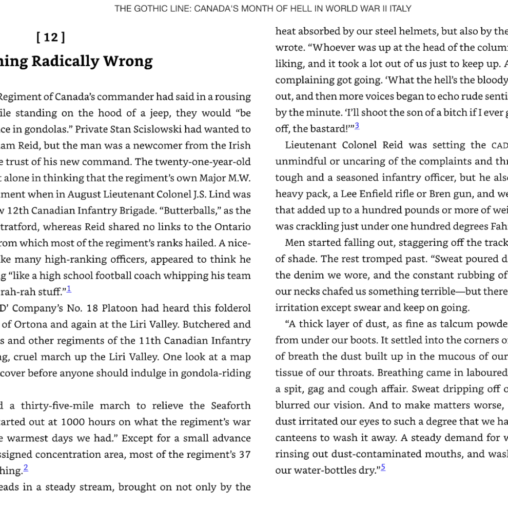 Si tratta di un libro “The Gotic Line – Canada’s month of hell in world war II Italy” di Mark Zuehlke (testo ovviamente in inglese) in cui l’autore ha raccolto le testimonianze dirette di numerosi soldati Canadesi che hanno partecipato alle varie fasi dello sfondamento della Linea Gotica.