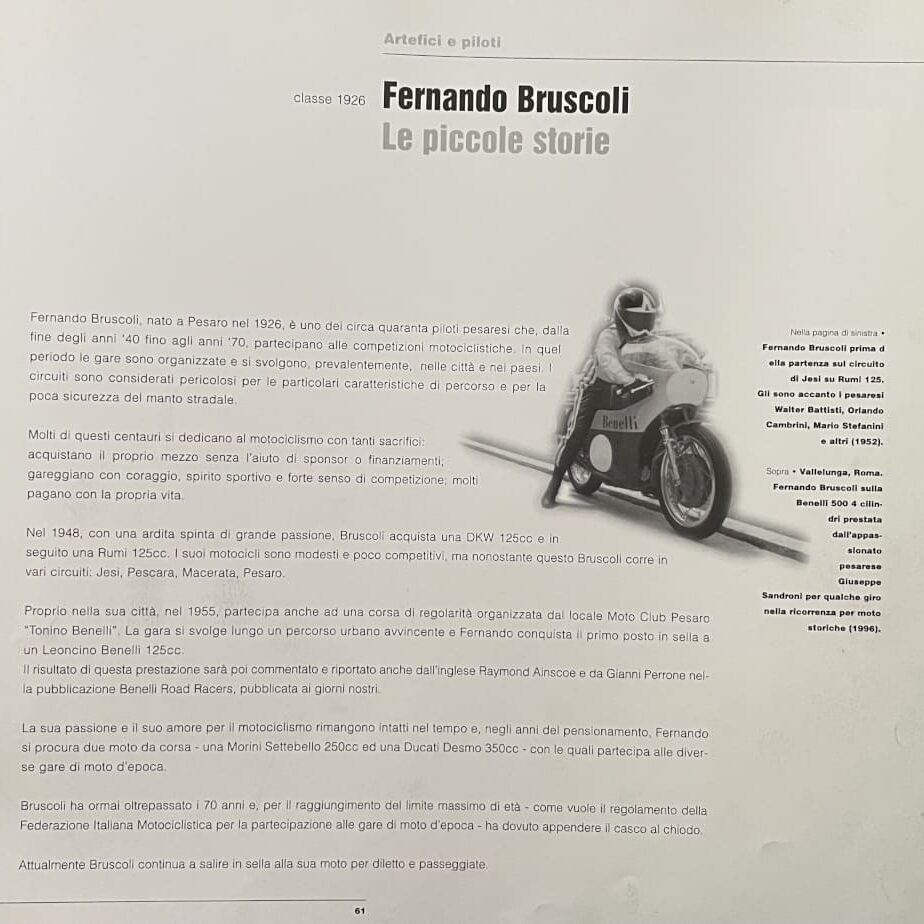 «Ci mancheranno la sua voglia di vivere e la sua infinita passione per i motori». Così Andrea Biancani, all’epoca consigliere regionale ha ricordato Fernando Bruscoli, memoria storica del motociclismo pesarese, classe 1926, in occasione della sua scomparsa nel 2019.